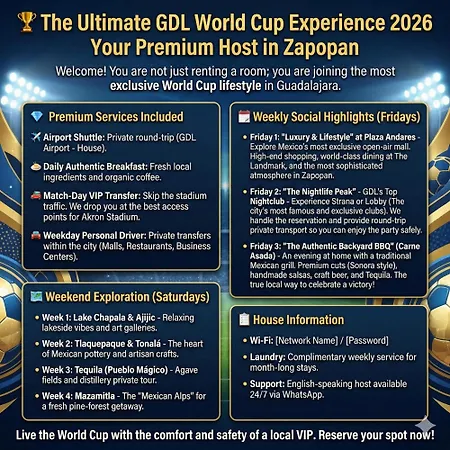 All-Inclusive World Cup Package Guadalajara hotel is situated in the Zapopan district, approximately a 15-minute ride from such family venues as the Natural Adventure Fun Park. Immerse yourself in this Guadalajara bed & breakfast's garden, complete with a patio area and an inner courtyard.